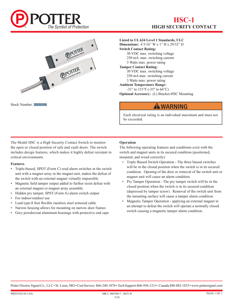 HSC型是一种安全的接触开关,用于监控保险箱门和保险库门的打开或关闭位置。该交换机包括设计功能,使其在关键环境中具有高度的抗故障能力。