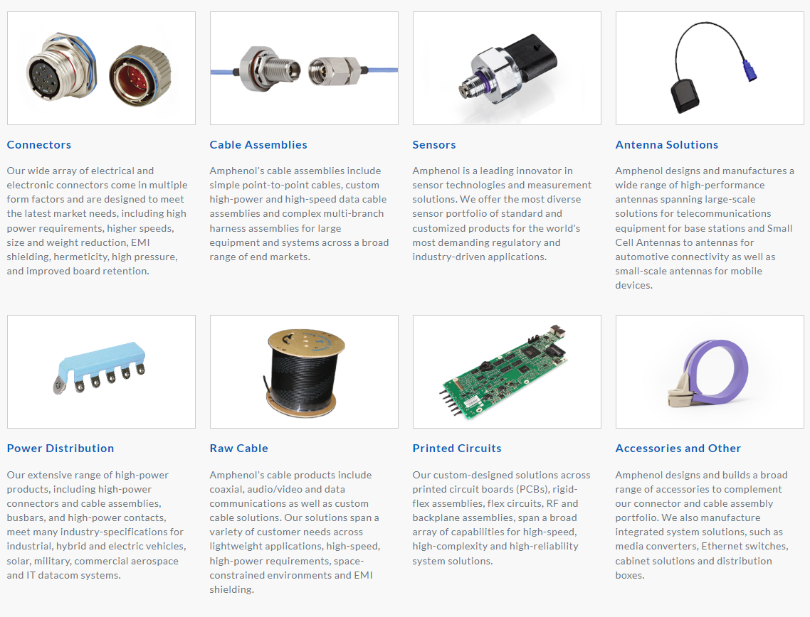 Amphenol Corporation致力于设计、制造和销售电气、电子和光纤连接器、互连系统以及同轴和扁平带状电缆。该公司为信息技术和通信设备应用开发了一系列连接器和互连产品,包括融合语音、视频和数据通信产品。Amphenol Corporation公司产品的主要终端市场是通信和信息处理市场、蜂窝电话和数据通信、信息处理系统、商用航空、航空航天和军用电子产品,以及汽车、铁路和其他交通和工业应用。